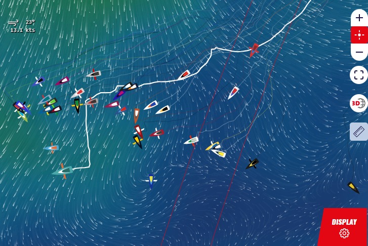 A mezőny nagyja még mindig összetömörödve – le Cammal és Colmannal ellentétben sokkal nyugatabbra – keresi a helyet, ahol a leggyorsabban át lehet vágni az előttük álló szélcsendes zónán. Vannak, akik még mindig nyugatnak tartanak, vannak, akik már leborítottak délre. Közülük kerül ki a mostani 2. helyezett Sebastien Simon (A képen kék-sárga hajó), de ő már benne is van a lavórban, sebessége 5 csomó, miközben a tőle nyugatra hajózóké még 17-20, sőt Sam Goodchild-nál (nyugatra tartó kékesszürke hajó) a tracking 21,5 csomót mutat.